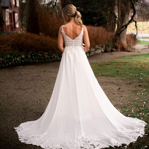 Stilren brudekjole. Helt nydelig å ha på seg. Lag på lag med svalt mykt stoff. Kjolen har ingen skader, vært brukt kun én gang, og den har vært til rens.