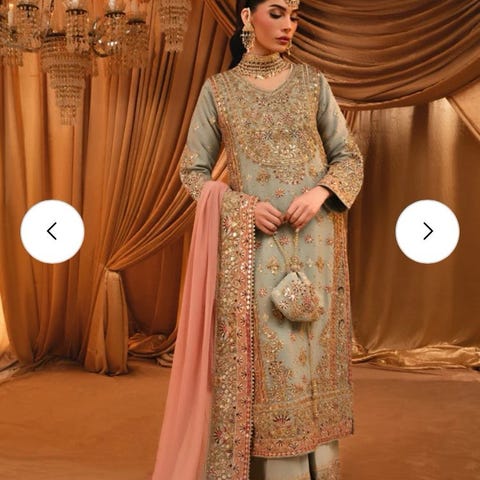 Suiten kommer i 4 deler, kjole, silk slip, sharara pants og dupatta.