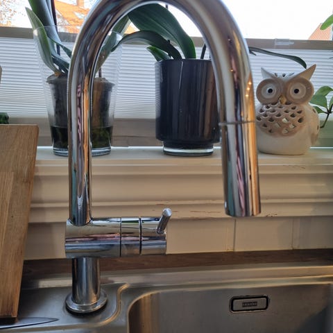 Kjøkkenbenkeplate med integrert vask. Vasken har en liten flis, se bildet.