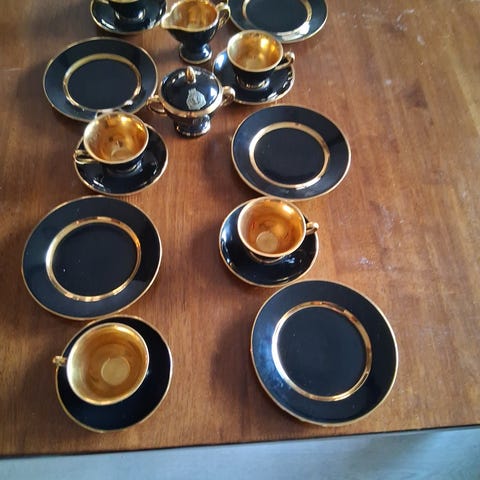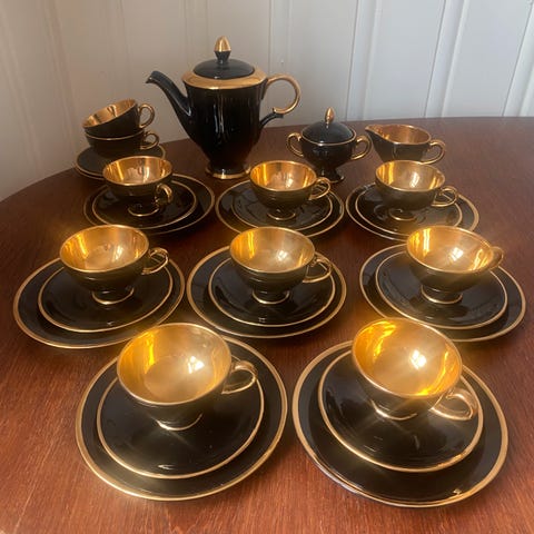 Flott mokkaservice i sort og gull fra Egersund Fayancefabrikk