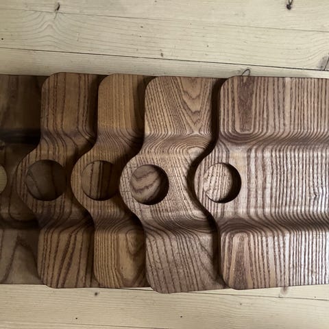 Min pappa har laget spekepølsefjøler i trehvit, hvit og rødbrun, disse selges.