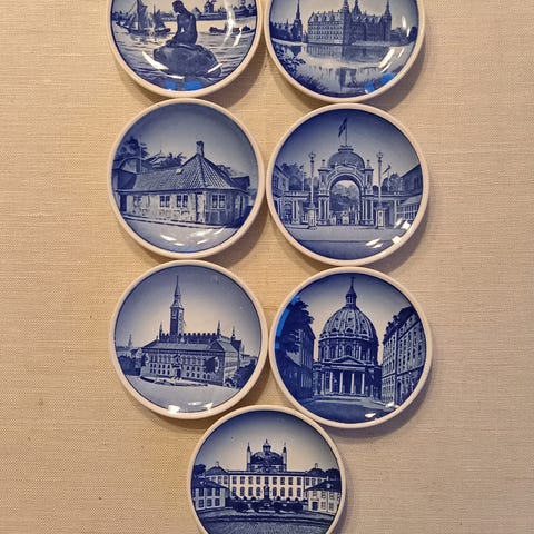 6 kuvertbeger i nydelig blåfarger fra royal Copenhagen fra 1970 tallet. Kjøpt i Danmark. Helt uten skader. Selges samlet for kr. 200.Sender gjerne med helthjem
