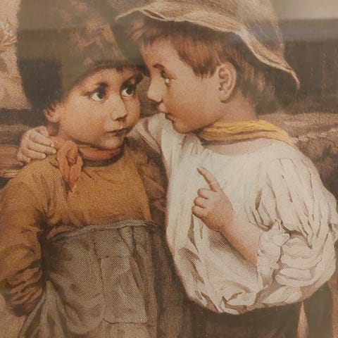 gammelt koselig nostalgisk bilde i flott ramme å glass