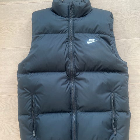 The North face dun vest svart selges pga. Lite brukt. Lommer foran med glidelås og en innerlomme. Regulerings strikk i sidene. Innbygd hette i halsen. Kom med bud