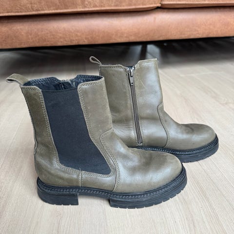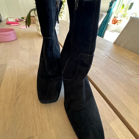 Svarte flate knehøye støvler. Faux patent stretch overdel. Chunky sporsåle. Innvendig glidelås.