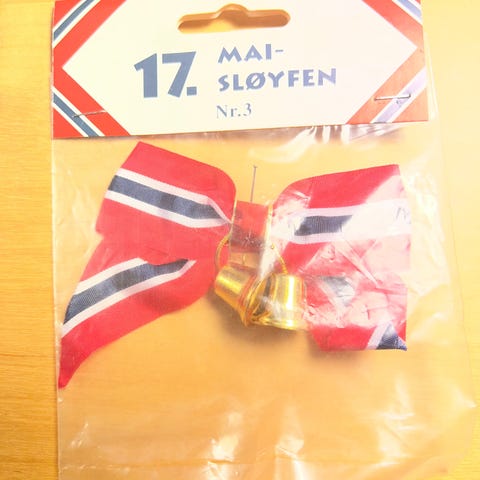 Norsk flagg brosje i emalje med 17. mai sløyfe
