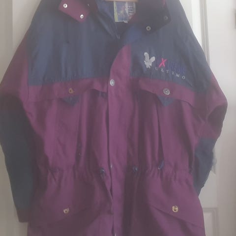 Blå jakke. 100% bomull. Tynn hette i kragen.