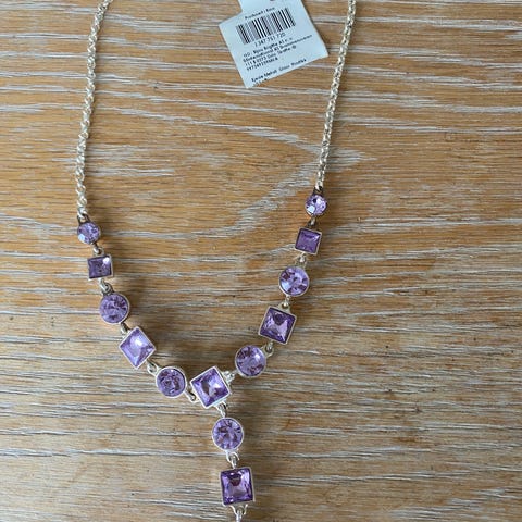 Flott langt halskjede med fine lilla farger. 50 cm. Har ligget i posen siden det ble kjøpt. Kr 150,-. Kan sendes. Kan sendes også med Fiks ferdig.