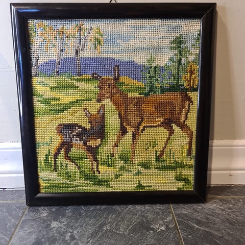 Stort fint brodert bilde i gullfarget ramme. Str 72,5 cm bredde og 57,5 cm høyde.