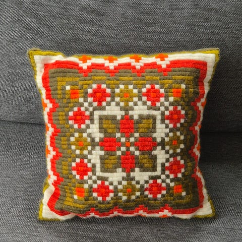 Veldig kul pute. Det er fyll i puten, men den må sys igjen der jeg har stappet inn innerpute. Jeg bestemte meg for å ikke sprette opp helt og ta ut siden den går akkurat i postkassen når jeg klemmer sammen, og kan da sendes med liten pakke fra Fiks ferdig.
