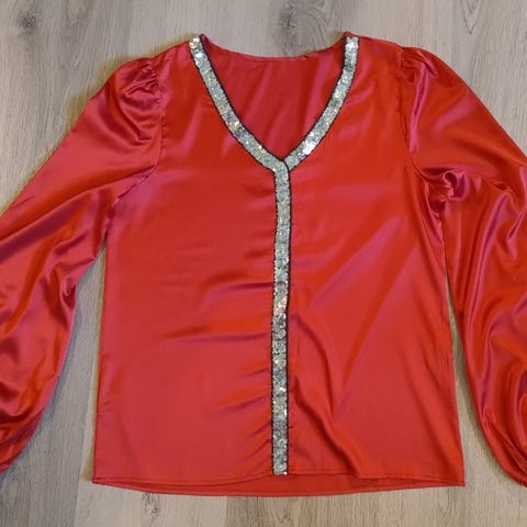 Superfin genser med litt gjennomsiktige ermer og paljetter på krave og mansjetter selges.