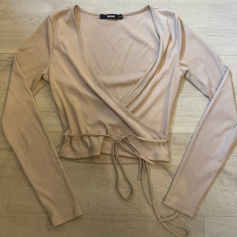 Blusen er i en fin rosa farge, har lange armer med knapper nederst og strikk i ryggen. Toppen kan knytes enten foran eller bak!