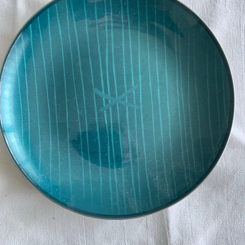 En flott grafisk Arabia Finland asjett / lite fat på 21 cm diameter. Noen merker/riper, men ingen nagg. Flott mørk blåfarge med mønster