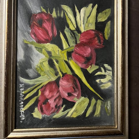 Pent bilde med blomster i duse farger. Tulipan bilde med ramme. Vivian White 80x60