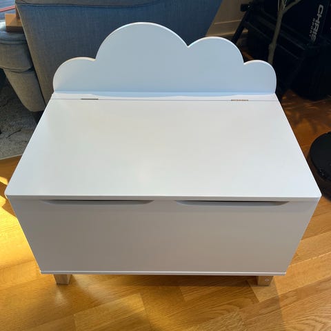 Sittebenk/lekebenk med oppbevaring under og koppholder med kopp.
