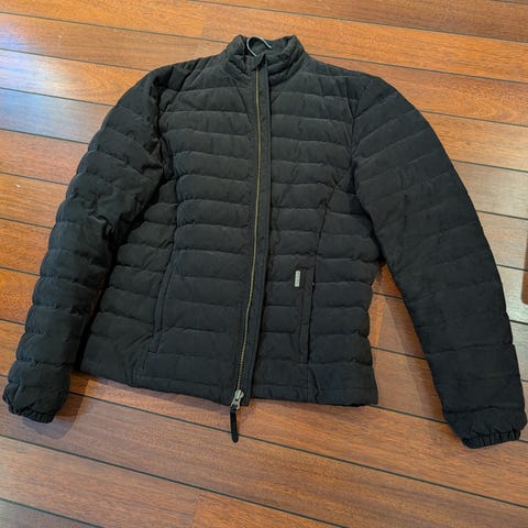 Dunjakke fra Woolrich i str. L og farge mørkblå selges. Jakken er pent brult uten synlig slitasje.