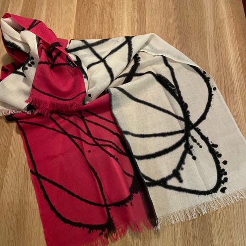Offwhite håndlaget skjerf i ull og silke, lengde ca 2 m og bredde ca 50 cm, brukt et par ganger og fremstår som nytt, selges kr 300,/