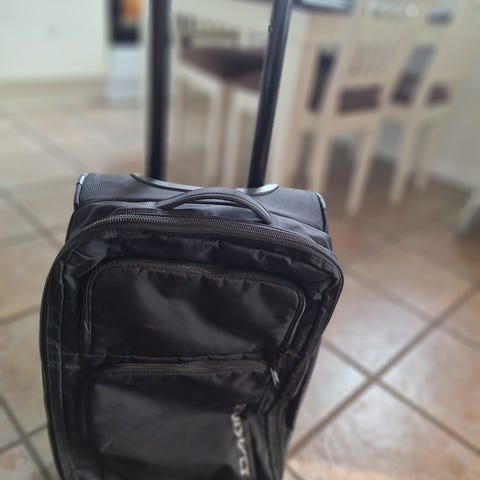Koffert-sett bestående av en Trille-koffert (52x37x18) og en Hånd-koffert(52x34x16) , Farge : mørkeblå m/ grønt og rødt . Pent brukt .