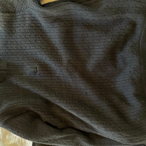 En liten flekk ved siden av glidelås ellers fremstår genseren som ny.