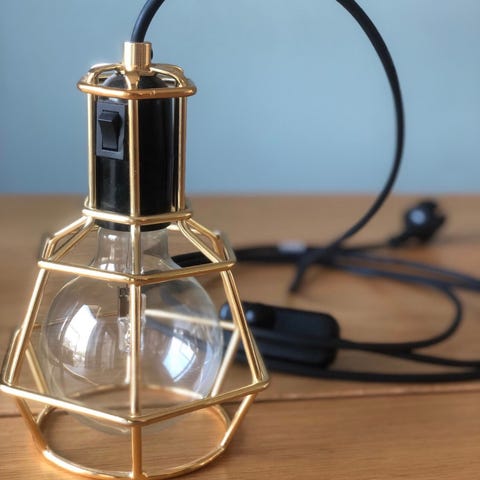Veldig kul lampe som kan brukes både som taklampe og liggende. Lampen jeg har er sølv/krom farge.