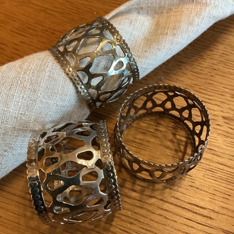 6 Utrolig kule vintage serviettringer i svart og rød string. Diameter ca 3,5cm og bredde ca 4cm. Noe slitasje.