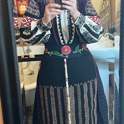 Hjemmesydd, bunadsinspirert festdrakt. Drakten er aldri brukt. Large (40) i størrelse. Hele drakten måler 135cm, underdelen måler 93 cm. Opplegg for snøring i overdelen. Hele plagget har vært på rens før salg. Cape i ull med dekorasjonselementer følger med. Ta kontakt for flere bilder/spørsmål.