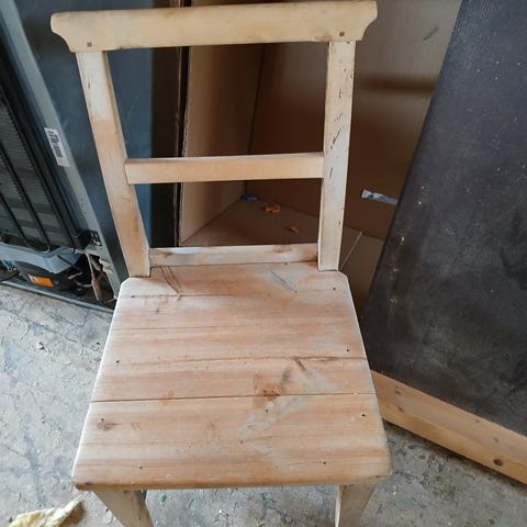 Gammel lyseblå stol i tre. 78 cm høy. Vintage, retro, antikk.
