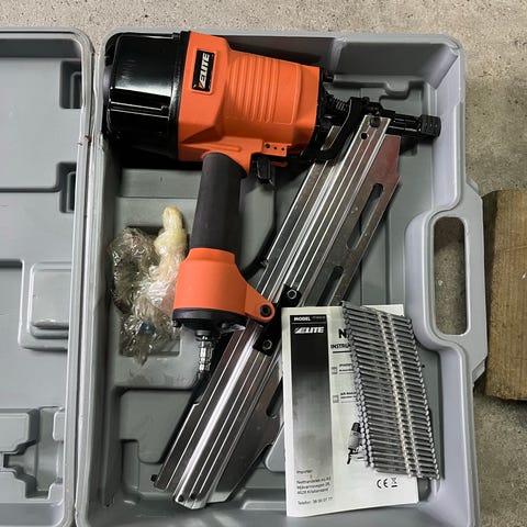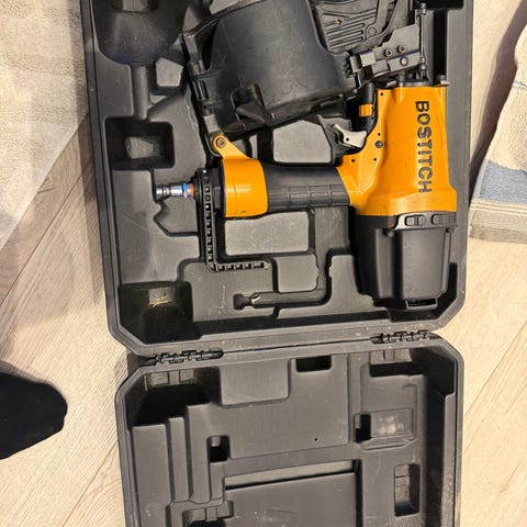 Lite brukt spikerpistol til herdet spiker, brukes til lister etc på mur, to pakker spiker følger med. I koffert