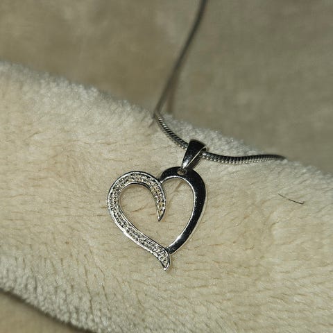 Sølvhjerte med safirer og blanke steiner selges. Kjede og anheng er stemplet 925 s. Lengde på kjede er 49,5 cm. Høyde på anhenget med opphenget er 2 cm. Bredde på toppen av hjerte er 1,4 cm. Pris 800 pluss 70 kroner i porto med sporing eller kan hentes i Oslo.