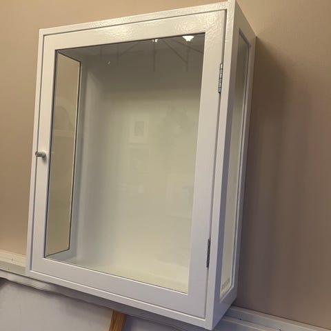 Selger en ubrukt hvit stor lyslykt i metall og glassvinduer, lyktens mål er 31x32,5 cm