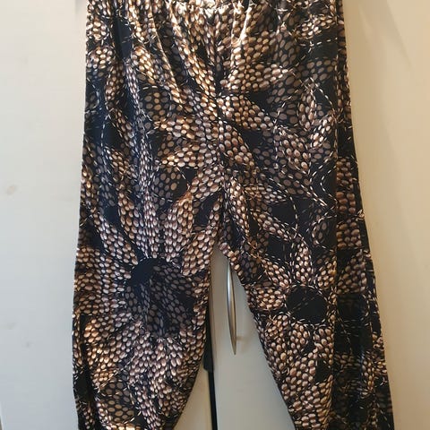 Sort- og hvitmønstrete silkebukse.