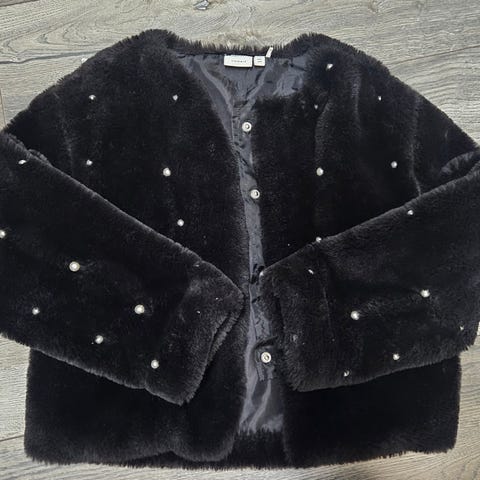 Pent og lite brukt kort jakke fra H&M, sort fuskepels med stedvis mørkeblått skjær. Str 158 / 13 år