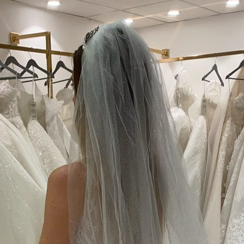 Stilrent og enkelt brudeslør med 2 lag tyll på 3m med festekam. Sløret føltes ikke tungt å bære. Sløret ble brukt i vårt bryllup i august i fjor og kun brukt i kirken og under fotografering. Ingen skader på sløret eller festekammen. Kommer fra et røyke- og dyrefritt hjem. Kan sendes i posten mot fraktkostnader.