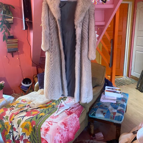 Str 38 og er litt romslig, lengde 130. (Damen på bildet er 175 høy). Kjøpt fra et konkursbo i 1989/90 fra pelsforretning. Pelsen har aldri vært i bruk. Den har likevel en liten rift i foret