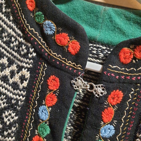 Håndstrikket koksgrå og hvit. Håndbrodert hals, stolpe og ermer, med tinnknapper.