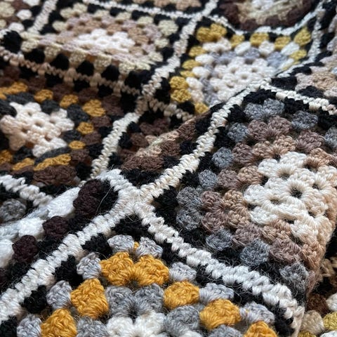 Heklet fargerikt teppe i ullgarn . Pent brukt .
