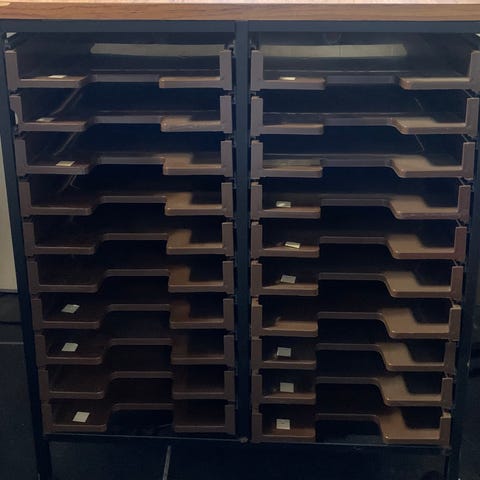 Elektrisk rulle arkiv med hyller og oppheng til feks journaler. 6 hyller