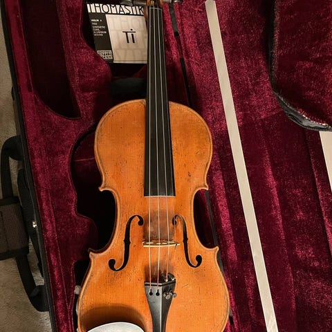 Fiolin, bue og kasse selges samlet for høystbydende.