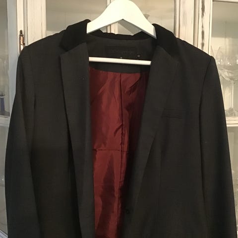 Sort, stilig jakke i blankt stoff. To lommer foran. Små skulderputer for passform. Én blank knapp foran.