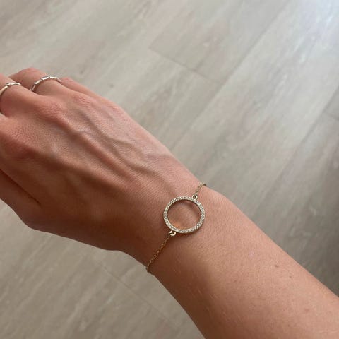 Har en skjedde av krystall og en skjedde av perler med en stor krystall som matcher armbåndet.