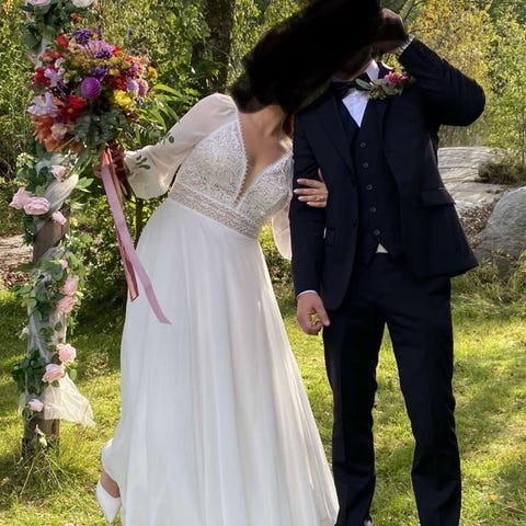 Pronovias Woodward brudekjole, opprinnelig kjøpt på Brudehuset i Bergen. Jeg kjøpte den selv på finn.no, så den er brukt to ganger.