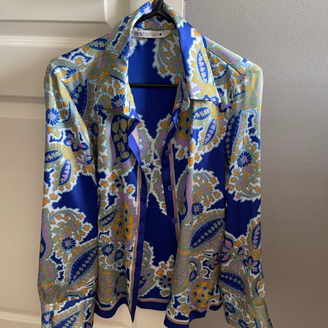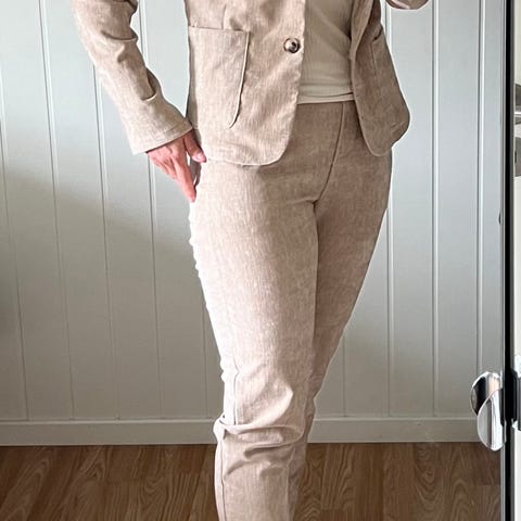 Bukser, bluse og veske set selges. Den ble brukt kun en gang. Stoffet er litt gjennomsiktig. Størelse M. Men kan passe hvis du bruker S også ( jeg bruker S selv). Farget er gammelrosa