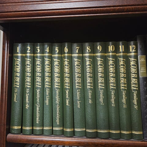 Diverse bøker (25 stk) av Jakop B. Bull selges for 800 kr.