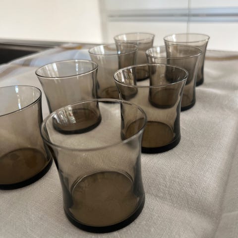 2 feilfrie glass i serien Mexico, designet av Willy Johansson for Hadeland Glassverk. Godset er tynt og sotfarget. Høyde 7,5 cm og diameter øverst 6,5 cm. Egnet til både hetvin og snaps, eller som lysglass. Kr 50,- pr stk.