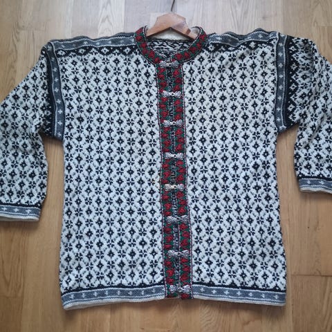 Svart/hvit hjemmestrikket genser med flotte dekorerte knapper