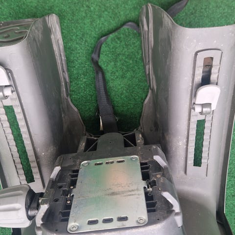Stabilt sete med hurtigfeste for montering på rammen slik at du enkelt kan ta av setet. Av formstøpt plast med plass til sykkelhjelmen. Høy rygg, fotstøtte, sittepute samt trepunktsbelte med spenne som kan åpnes med én hånd. Justerbart beltefeste, og justerbare fotbånd. Fotstøtten kan heves/senkes hele 15 cm.
