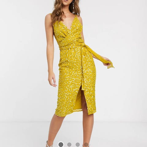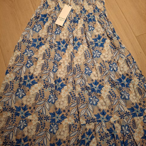 Ubrukt kjole m/tag str L/XL. Viskose. Strikk i ryggparti som gjør at den sitter. Knapper i front. Regulerbare stropper. Tynt belte man kan velge om man vil bruke i samme stoff og print. Pris er satt 😊