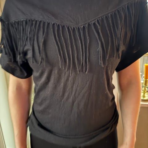 Skjorte fra One & Other med løs passform og frynser. Feminin silhuett. Fin både til hverdags og fest! Strykefri. Pent brukt.