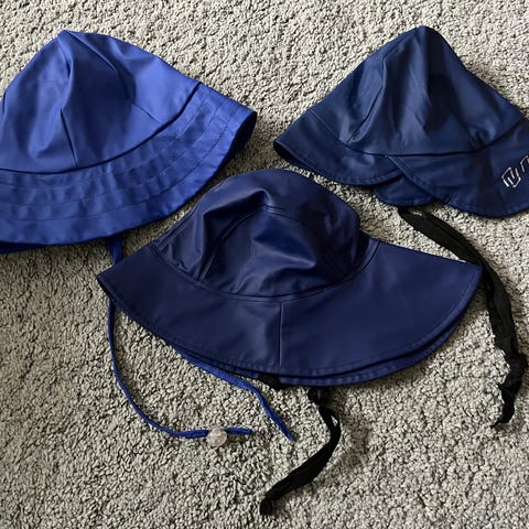 Brukt solhatt fra Hm. Str 62-68. Motiv seilbåt. Mørk blå grunnfarge. Hvit båt. Har brem foran og stykke bak som dekker nakken.