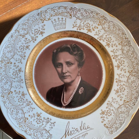 Flott eksemplar av samleplatten med kronprinsessen, som var Norges førstedame under 2. verdenskrig og som ble dronningen vi aldri fikk. Ingen hakk eller sår, kun et par ørsmå riper i glasuren.